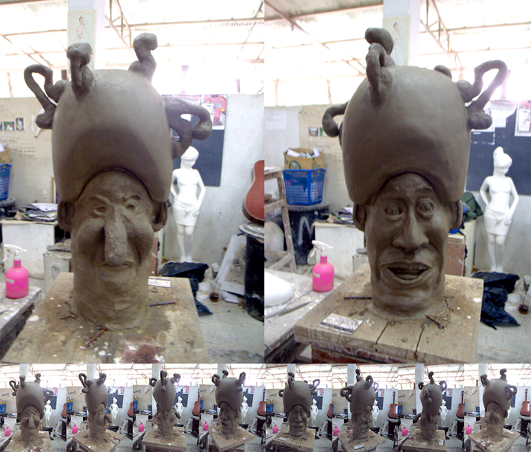 アムと仲の良かったミントは、彫刻科で学んでいた。英語はほとんどで、僕のタイ語も拙かったが、その姿勢からやっていることが好きで自信があるんだろうということはよく分かった。ある日、学校について行ったついでにノリで先生に作品を見せて、彫刻を勉強させて欲しいことを伝えると、なんと先生からのOKが出て、次の日から粘土を使って彫刻をはじめることになった。特に授業みたいなものはなく、学校へ行くと与えられた場所で作品作りをした。大量の粘土をもらって、頭から脳の一部が溢れ出ている「頭の良すぎる男たち」という作品をつくっていた。両面に2つの顔があり、グルリと回ると2つの顔がみられるというもので、平面では表現できない立体の面白さがあった。